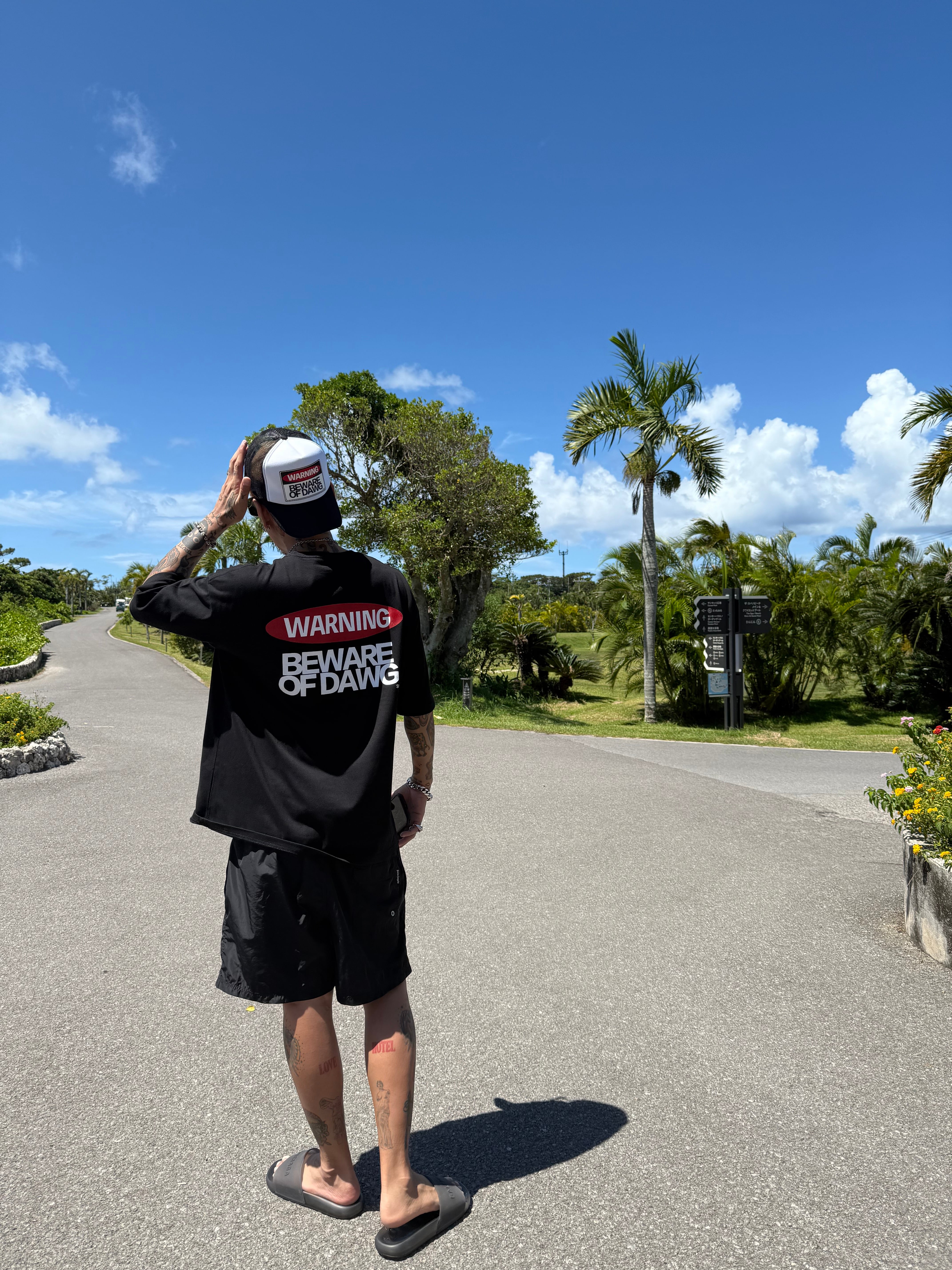 フロントにはワンポイントロゴ、背面には「WARNING - BEWARE OF DOG(警告:猛犬注意)」の標識をオマージュしたメッセージを大胆に配置。ストリートマインドあふれるグラフィックが目を引く一着。