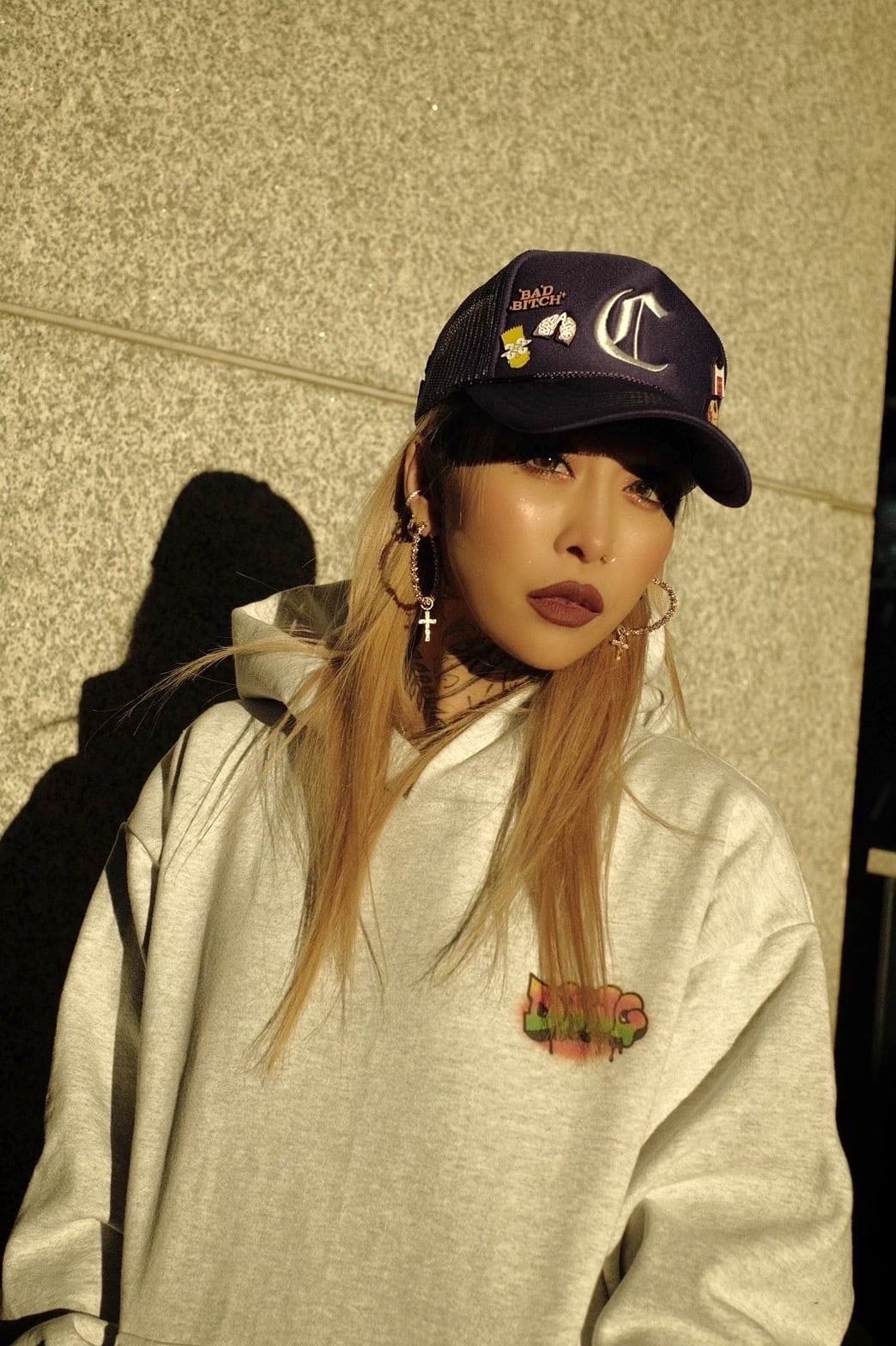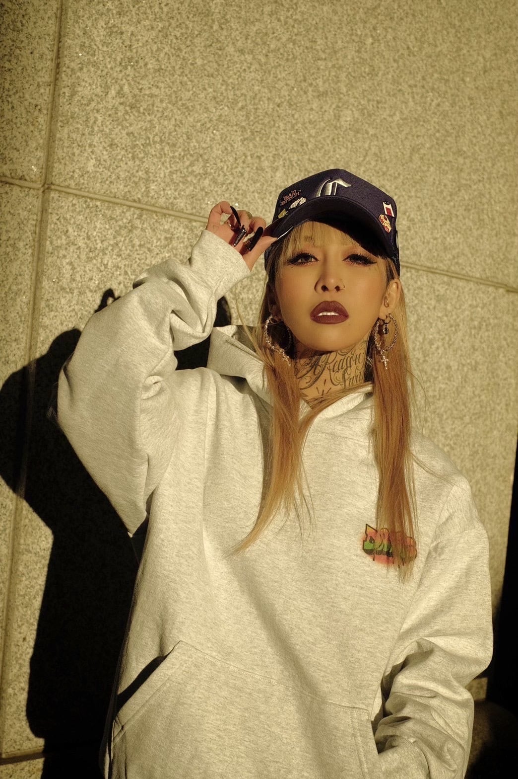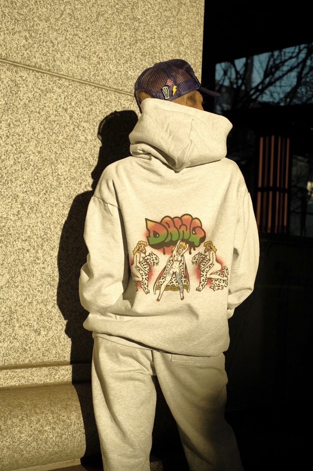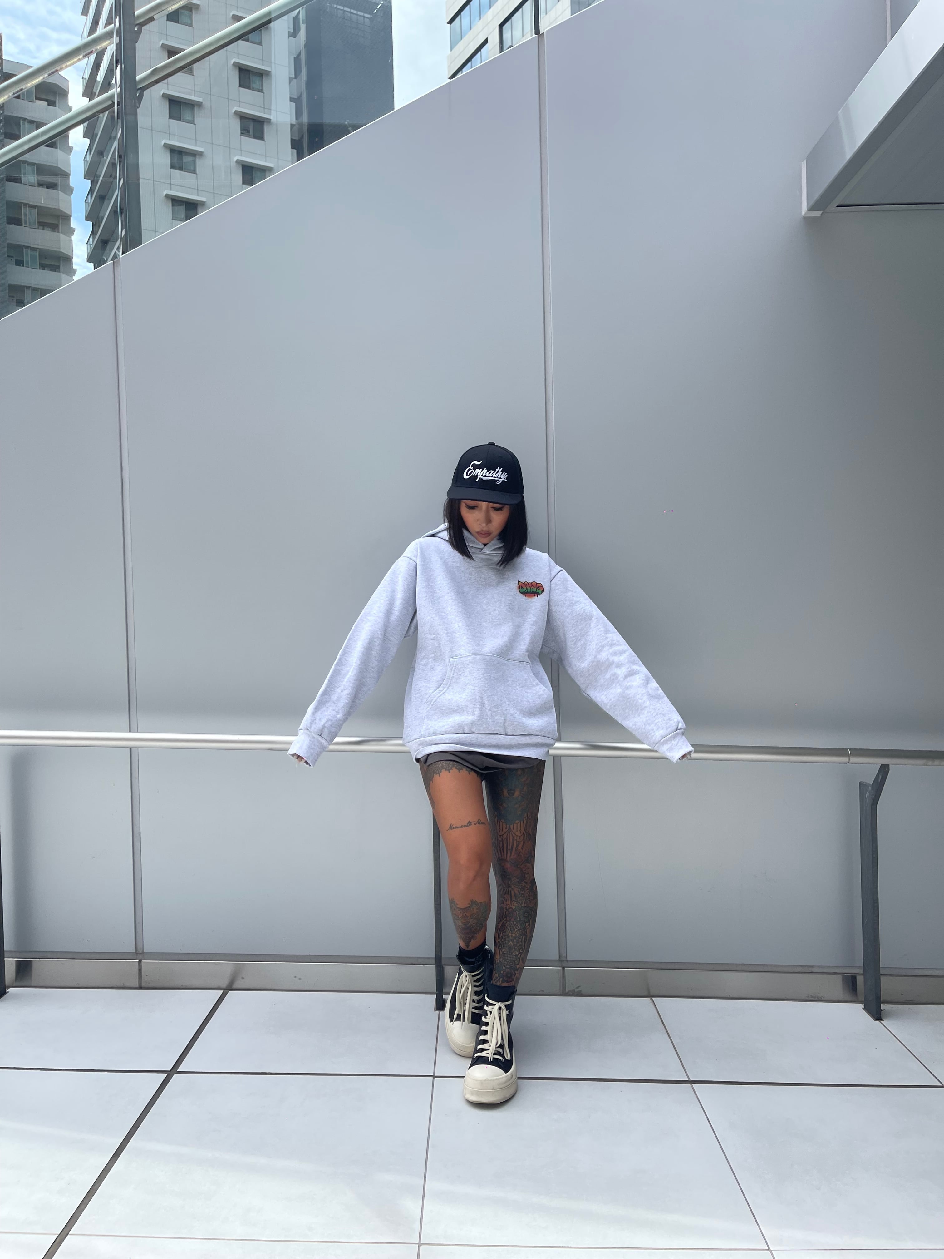 お腹はオーセンティックなカンガルーポケット。フードは存在感のある2重仕立てで、ドローコードはなく、クロスした首元がモダンなディティール。形は旬なボックスシルエット。